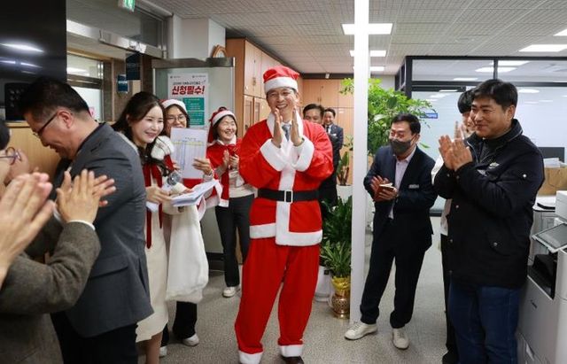 우승희 영암군수는 산타복을 입고, 각 부서와 장소를 방문해 간식과 감사의 인사를 전했다.