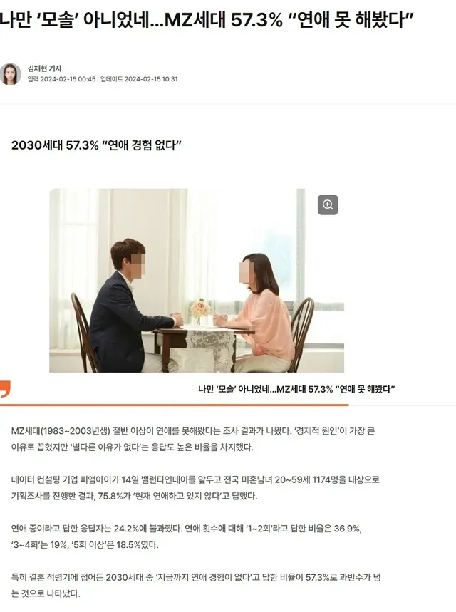 20대 응답자 35.4%가 모솔이라고 했고