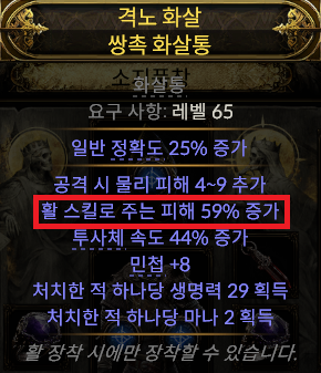 무기는 직업이나 본인이 선택한 빌드에 따라 조금씩 갈린다. 다만 핵심은 ‘피해를 퍼센트 단위로 증가’시키는 스탯이다. 일례로 ‘데드아이’나 ‘패스파인더’가 사용하는 활의 경우 가장 중요한 스탯은 ‘물리 피해 XX% 증가’다. 거래소에서 높은 DPS를 가진 활들은 대부분은 해당 스탯을 보유하고 있다. 화살통의 경우에는 ‘활 스킬로 주는 피해 XX% 증가’ 스탯이 높은 물건이 좋다.