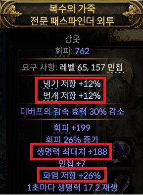 거래소에서 투구, 갑옷, 장갑, 허리띠, 목걸이, 반지 등 방어구를 볼 때는 ‘생명력 최대치’와 ‘저항’이 스탯이 높은 상품을 눈여겨봐야 한다. 앞서 언급한 2가지 스탯에만 집중하면 대부분 ‘1엑잘티브 오브’라는 저렴한 가격에 각 부위 방어구를 획득할 수 있다.