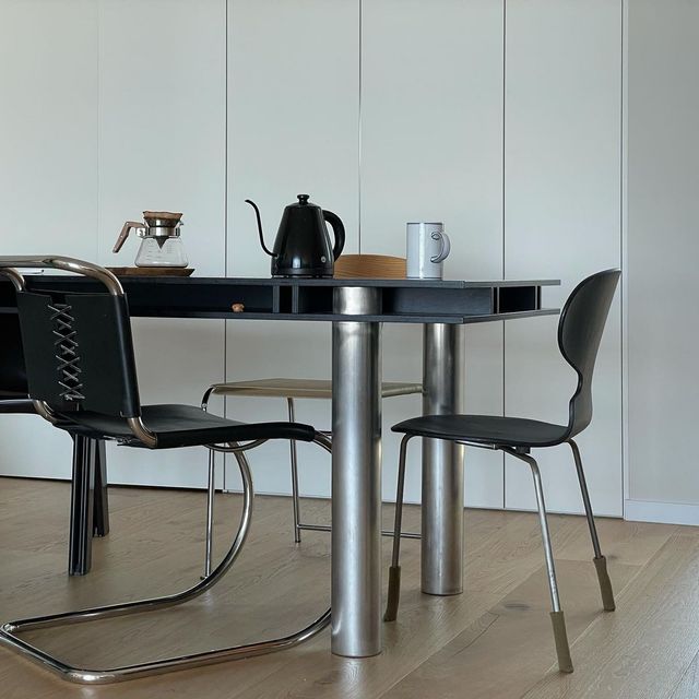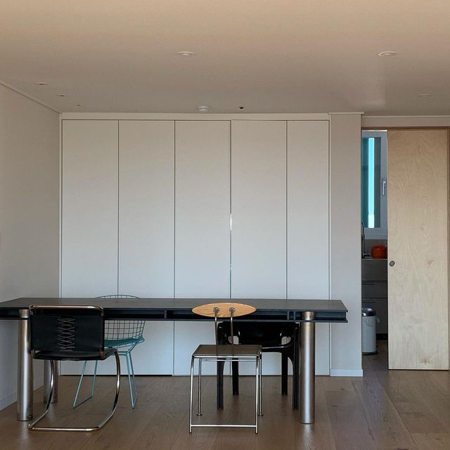 의자의 소재와 특성이 너무 다 달라 혼란스러워 보일 수 있는 상황이었는데, 식탁을 검은색 상판과 스틸 다리로 구성된 심플한 디자인으로 두니 다 품어주더라고요. 식탁이 중심을 잘 잡아주는 느낌이에요.