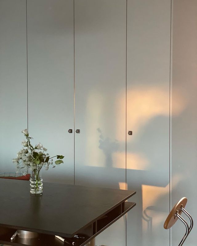 식탁 위 벽면에는 오래전에 구입한 Kiyo 작가님의 거울 작품과 빈티지 소품 숍에서 찾은 액자들을 함께 걸어 두었어요. 이 자리에서 지인들과 옹기종기 모여 샴페인 한 잔을 즐기는 걸 특히 좋아해요. 맑고 투명한 기포들이 만들어내는 설렘이 참 근사하거든요. 비록 와알못이지만 와인을 마시는 즐거움만큼은 놓치지 않으려 해요. 올 연말에는 홈파티를 계획 중인데, 그때는 위키드와이프(@wkd.seoul)를 이용해 볼까 해요.