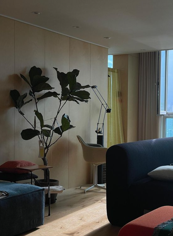 거실 한쪽 벽면을 자작나무 합판으로 선택한 이유는 그 자체로도 따뜻한 질감과 자연스러움을 지니고 있어서예요. 마감해야 할 벽면은 5.4m에 달했는데요. 한 판으로 마감하면 너무 단조로워 보일 것 같아 전체 벽 길이를 균등하게 나눠 잡았어요. 빈 벽에 남아 있던 거푸집 흔적의 비율이 유난히 마음에 들어 그대로 디자인에 반영한 부분도 있고요.