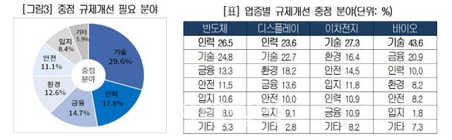 기업들은 향후 첨단산업 규제개선에 중점을 두고 추진해야 할 분야로 기술(29.6%), 인력(17.8%), 금융(14.7%), 환경(12.6%) 순으로 응답했다. 가장 많은 기업이 중점 규제개선 분야로 꼽은 것은 연구개발(R&D), 인증·검사 등과 관련된 이른바 ‘기술규제’다. 특히 바이오 기업의 43.6%가 기술규제 개선이 중요하다고 답했다.