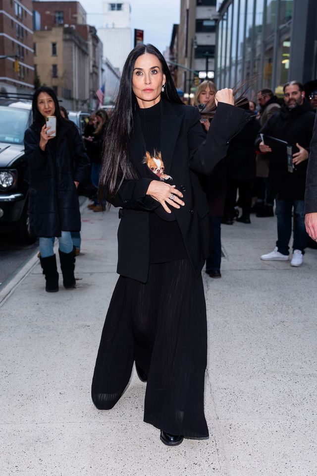 데미 무어, 하지만 반려견 필라프에게 그의 품은 세상에서 가장 따스하고 안락한 곳입니다. 블랙 맥시 드레스에 시크한 블레이저를 걸친 데미 무어 품속에 둥지를 튼 손바닥만 한 치와와라니, 이보다 사랑스러운 조합이 또 있을까요?
