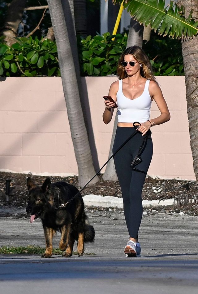 지젤 번천 역시 우직한 도그워커로 잘 알려져 있습니다. 한 치의 오점 없이 탄탄한 실루엣을 자랑하는 보디라인답게 그의 산책 룩으로는 탱크 톱과 레깅스처럼 에슬레저의 정석과도 같은 아이템이 자주 등장하죠.