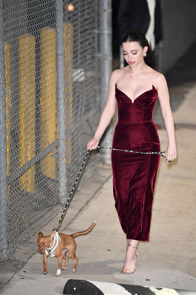 미키 매디슨은 광기의 도그워커입니다. 뮈글러의 우아한 버건디 벨벳 미디 드레스를 차려입은 그에게 지금 이 순간 무엇보다도 중요한 건 예쁜 옷도, 화려한 조명도 아닌 반려견과 함께하는 산책 시간이죠.