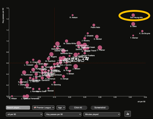 데이터MB는 X축에 프리미어리그 공격형 미드필더 및 윙어들의 90분 환산 기대 어시스트(xA)값, Y축에 90분 환산 키패스 횟수를 표시해 2차원 그래프를 만들었는데 손흥민이 가장 오른쪽 상단이 자리잡은 것으로 드러났다.