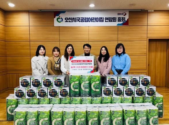 [와이뉴스] 오산시 신장1동은 오산시국공립어린이집연합회가 지난 23일 어린이집 학부모, 원아, 교사들이 직접 참여한 우유팩 회수 자원봉사 활동의 결실로 베지밀 1,000개와 재생화장지 900개를 신장1동행정복지센터에 기탁했다고 전했다.
