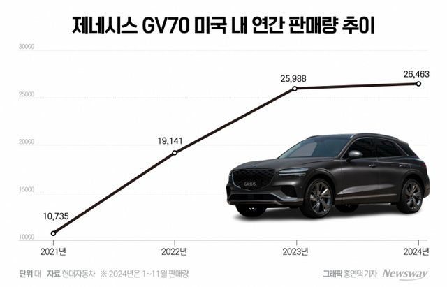 자동차 업계 관계자는 "연간 판매량 증가 폭이 다소 완만해지고 있지만 어려운 여건 속에서도 GV70의 미국 시장 내 판매량은 꾸준히 늘고 있다"면서 "현지 시장의 기조에 맞춘 공급·영업 전략 덕분에 새해에도 미국에서 의미 있는 성과를 올리게 될 것"이라고 내다봤다.