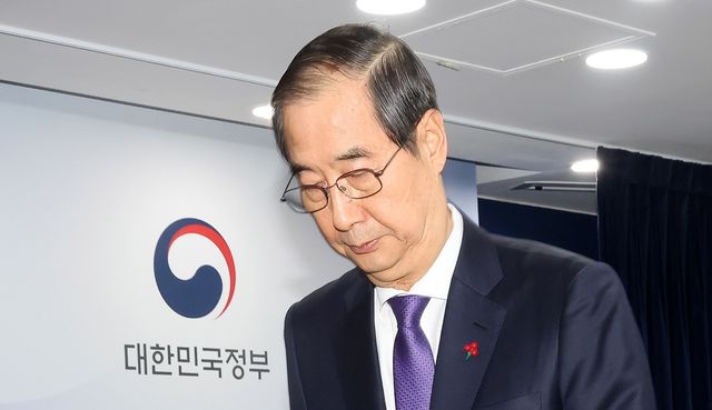 한덕수 대통령 권한대행 국무총리가 지난 26일 서울 종로구 정부서울청사에서 긴급 대국민담화를 발표한 뒤 브리핑실을 나서고 있다. 국회는 27일 오후 본회의를 열어 한덕수 대통령 권한대행 국무총리 탄핵소추안을 표결한다. / 뉴스1