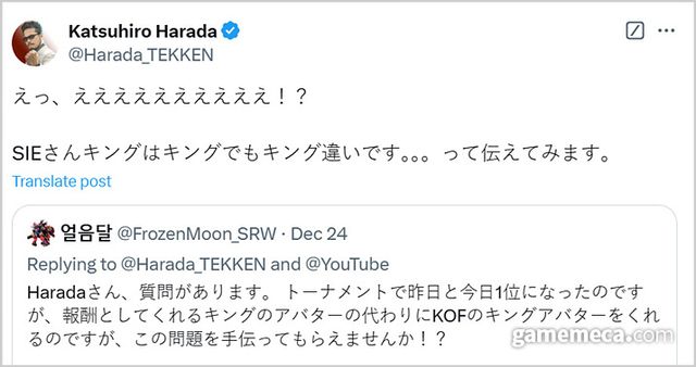 이를 확인한 유저들은 “킹받네 정말”, “이렇게 된 거 킹도 철권 8에 참전하면 되겠네”, “킹 대 킹 드림매치 가보자!” 등 유쾌한 반응을 보이고 있다. 철권 8 디렉터 하라다 마츠히로와 SNK 소속 개발자 오다 야스유키도 개인 SNS 계정을 통해 “제가 소니씨한테 그 킹과 철권 킹은 다르다고 전달할게요”, “꽤나 돌직구적인 실수네요” 등 다양한 반응을 남겼다.