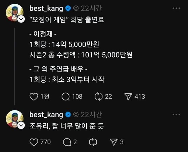 게시글에는 "이정재는 1회당 14억 5000만 원, 시즌2 총 수령액 101억 5,000만 원이다"라며 "그 외 주연급 배우는 1회당 최소 3억부터 시작한다"라고 전해졌다.