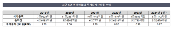 넷마블의 이 같은 주가는 장부상 적정수준에도 미치지 못하는 수준이다. 실제 이 회사 주가(27일 종가 기준 5만1400원)는 주가순자산비율(PBR)을 활용해 계산한 적정주가 대비 37.9% 낮은 수준이다. 이 회사의 순자산가치는 올해 3분기 말 5조2679억원으로 집계됐고 같은 기간 상장된 주식 수 8595만3502주를 기준으로 계상한 주당순자산가치는 5만9500원이다. 여기에 최근 5년여간(2019~2024년 3분기 말) 평균 PBR 배수 1.39배를 적용하면 적정주가는 8만2903원으로 추산된다.