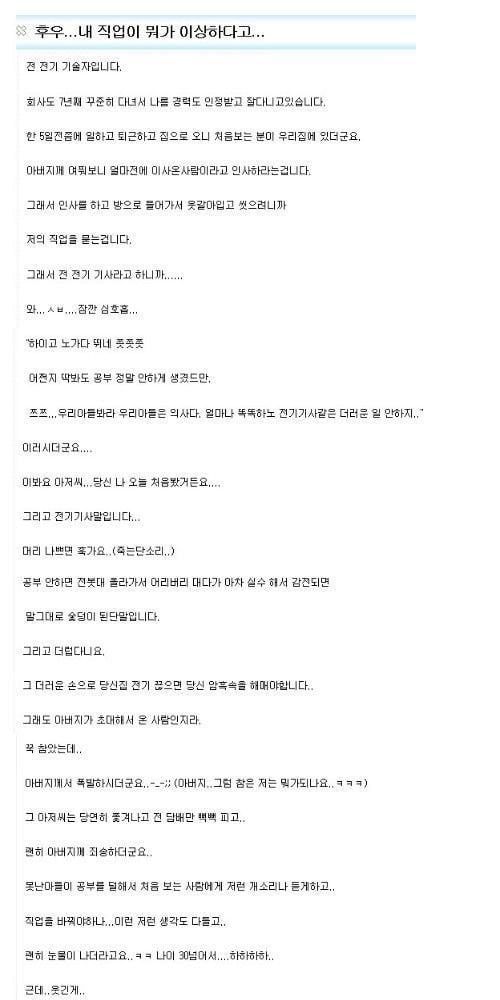 한 전기 기술자가 겪은 재미있는 하루의 이야기가 화제가 되고 있다. 이 기술자는 평소와 다름없이 일상적인 업무를 마치고 집으로 돌아가던 중 한 아저씨를 만났다. 처음 보는 이 아저씨는 “당신 오늘 처음 봤다”며 다짜고짜 말을 걸어왔다. 이내 아저씨는 그의 직업에 대해 묻기 시작했다. “전기기사”라는 대답에 아저씨는 한참을 웃으며, 전기기사를 마치 군사 전략가처럼 묘사하기 시작했다.