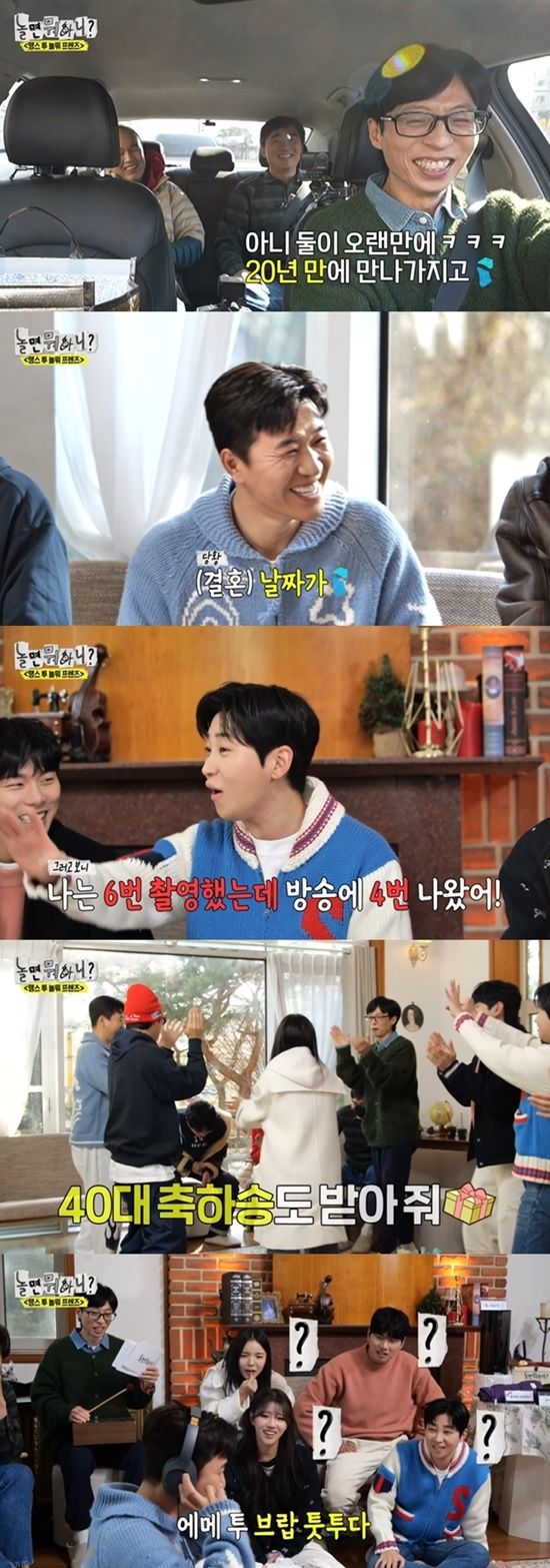 28일 방송된 MBC '놀면 뭐하니?'는 '땡스 투 놀뭐 프렌즈' 편으로 꾸며졌다. 일 년 동안 ‘놀면 뭐하니?’를 빛내준 친구들 김광규, 김석훈, 김종민, 딘딘과 함께 송년회를 하는 멤버들의 모습이 그려졌다.