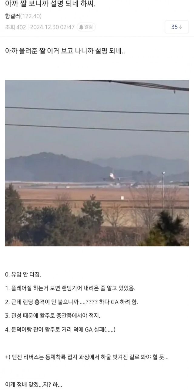 원인은 모르겠지만 랜딩기어 안 내려온거 자체를 모르지않았을까싶은데 얼마나 당황스러우셨을까싶어서 안타깝네 정말 ㅜㅜ