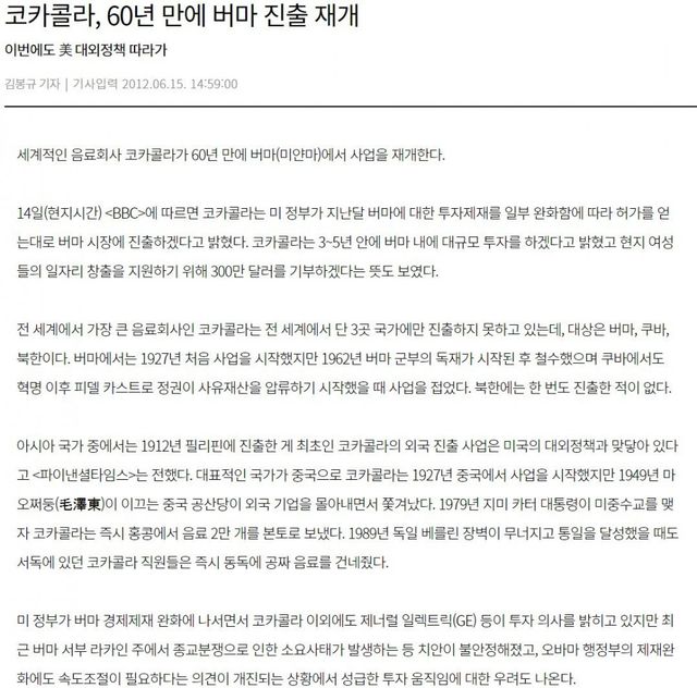 여담이지만 미얀마가 코카콜라 진출할때 북한 쿠바 제외하고 가장 늦게 진출했다고함