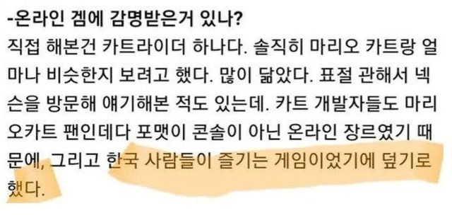 코다 미네오 : 분명 넥슨의 카트라이더와 닌텐도의 마리오 카트가 서로 닮았다. 그 점 때문에 많은 이들이 관심을 가졌을 것으로 생각된다. 하지만 닌텐도는 한국에 있는 다른 게임 개발 회사와 똑같이 넥슨에 대해서도 건설적인 관계로 생각하고 있을 뿐이다. 서로 경쟁하면서 피해를 입히는 것은 닌텐도에게도 좋은 일이 아니기 때문이다.