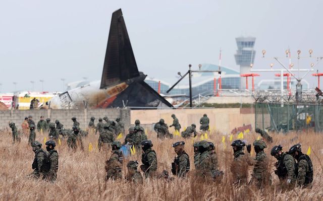 30일 오전 전남 무안국제공항에서 군인들이 전날 발생한 제주항공 여객기 충돌 폭발 사고 잔해를 수색하고 있다 / 뉴스1