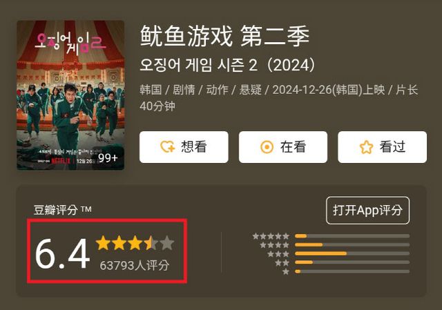 중국 콘텐츠 리뷰 사이트 더우반(豆瓣)에서는 ‘오징어게임2’의 리뷰 화면이 공개 전부터 만들어졌고, 현재 6만 여 건의 리뷰가 남겨져 있다.
