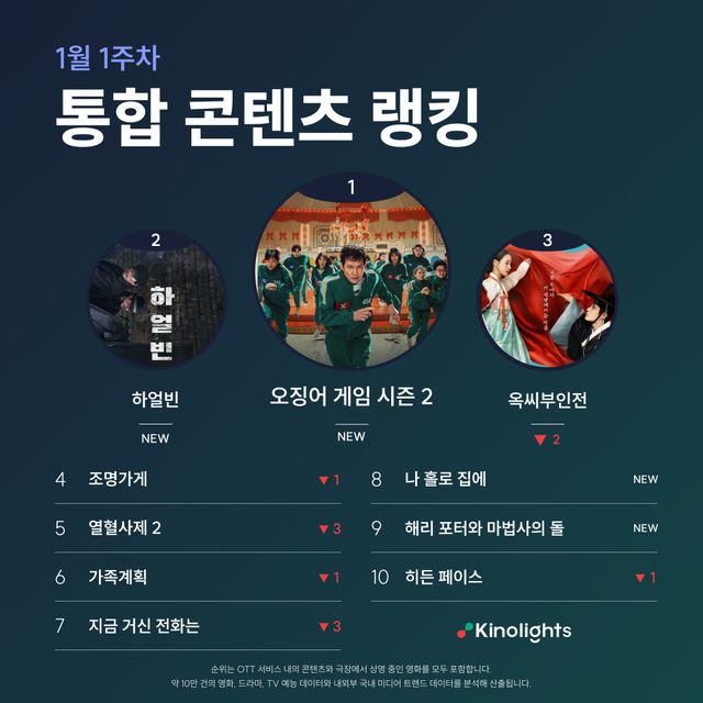 12월 마지막주 통합 콘텐츠 랭킹에서는 3년 만에 두 번째 시즌으로 돌아온 넷플릭스의 오리지널 시리즈 '오징어 게임 시즌 2'가 공개 후 나흘 만에 1위에 오르며 눈길을 끈다.