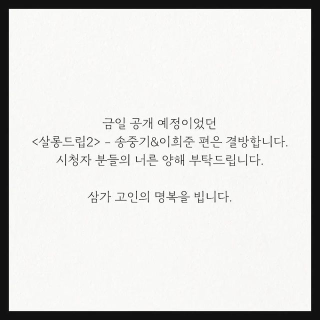 31일 유튜브 채널 'TEO 테오'는 "'살롱드립2' - 송중기&이희준 편은 결방한다. 해당 회차는 1월 7일 오후 6시 공개 예정이다. 시청자분들의 너른 양해 부탁드린다"라며 "삼가 고인의 명복을 빕니다"라고 제주항공 참사에 애도를 표했다.