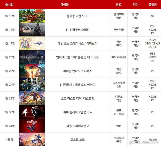 ▲ 2025년 1월 게임 기대작 (표: 게임메카 제작)