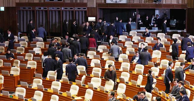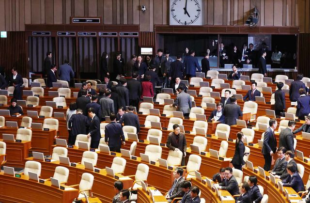 국민의힘 의원들이 지난달 14일 오후 서울 여의도 국회에서 열린 제419회국회(임시회) 제4차 본회의에서 윤석열 대통령 탄핵소추안이 가결되자 본회의장을 나서고 있다. / 뉴스1