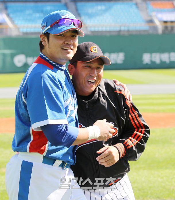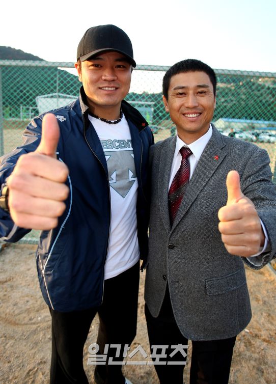 2010년 11월 3일 오후 부산 사직구장에서 열린 광저우아시안게임 야구대표팀과 롯데 자이언츠의 연습경기에 앞서 추신수와 외삼촌인 롯데 박정태 코치가 만나 반갑게 인사하고 있다. IS 포토