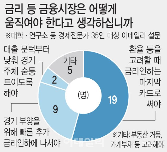 다만 내수 경기 부양을 위해 금리 인하가 필요하다는 의견도 나오고 있다. 전체 응답자 중 27.8%(10명)는 한은이 추가 금리 인하에 빠르게 나서야 한다고 주문했다. 강성진 고려대 경제학과 교수는 “과거에 많이 올리지 않아서 인하할 수 있는 여력은 많이 없지만 금리는 인하할 수밖에 없다”며 “(금리 인하를 통해) 경기를 진작하고 소비도 촉진해야 한다”고 강조했다.
