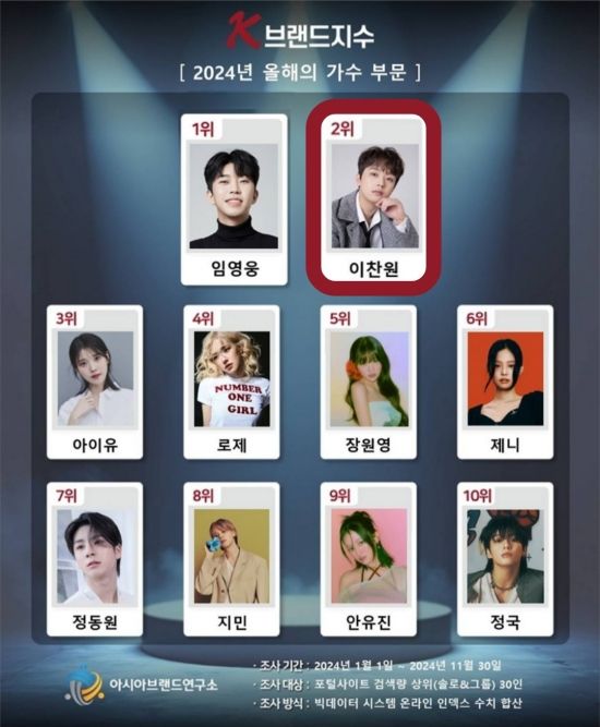 이번 K-브랜드지수 올해의 가수 부문은 포털사이트 검색량 가수 상위 30인을 대상으로 진행됐으며, 2024년 1월 1일부터 11월 30일까지의 온라인 빅데이터 56억 4,351만 5,549건을 분석했다.