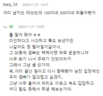 헤어지자고 하니 그제서야 100 : 100 으로 하면 허락해주겠다