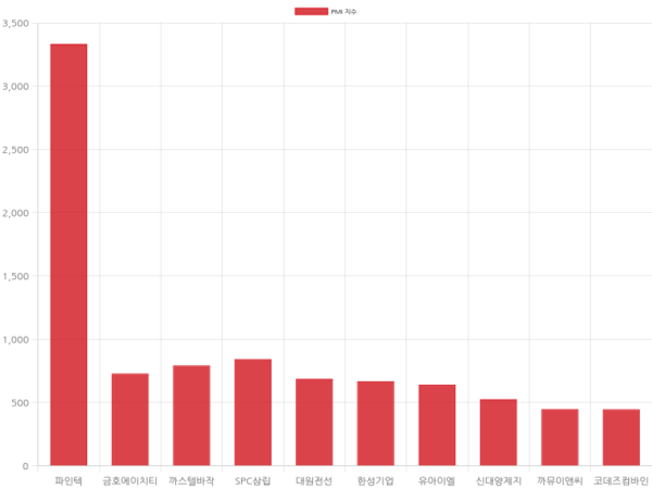 파인텍은 인지도 지수 7.36포인트와 소셜 트렌드 지수 73.69포인트를 기록하며 높은 주목을 받고 있다. 금호에이치티는 인지도 지수 1.20포인트, 소셜 트렌드 지수 12.09포인트를 기록 중이다. 까스텔바작은 인지도 지수 1.19포인트, 소셜 트렌드 지수 11.99포인트를 나타내고 있다. SPC삼립은 인지도 지수 1.01포인트와 소셜 트렌드 지수 10.14포인트를 기록하고 있으며, 대원전선은 인지도 지수 0.92포인트와 소셜 트렌드 지수 9.28포인트를 나타내고 있다.