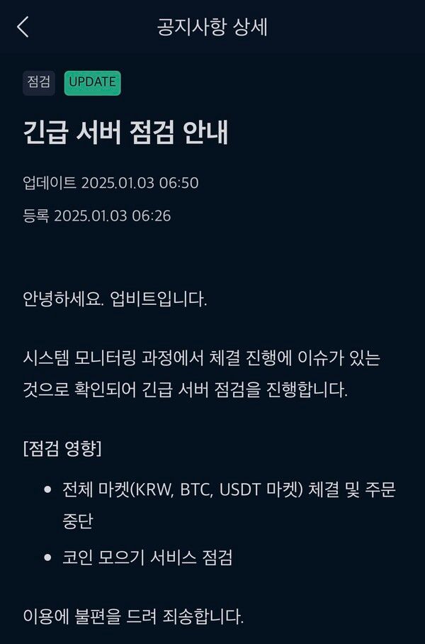업비트 측은 “시스템 모니터링 과정에서 체결 진행에 이슈가 있는 것으로 확인되어 긴급 서버 점검을 진행한다”고 공지했다.