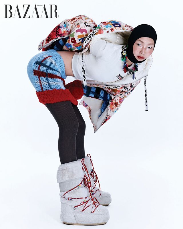 그래피티 쇼트 패딩은 1백78만원대 Khrisjoy. 티셔츠는 58만원 Moncler×Palm Angels. 니 트 스커트는 Dainty Knit. 발라클라바는 Philosophy. 멀티 컬러 ‘컬렉터’ 목걸이는 Balenciaga. 스타킹은 3만6천원 Delidi. 페이크 퍼 롱 부츠는 75만원 Moon Boot by BOONTHESHOP.