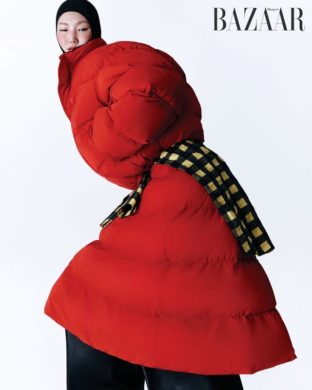 패딩 세트업, 부츠는 Balenciaga. 허리에 묶은 셔츠는 Bottega Veneta. 발라클라바는 Philosophy.
