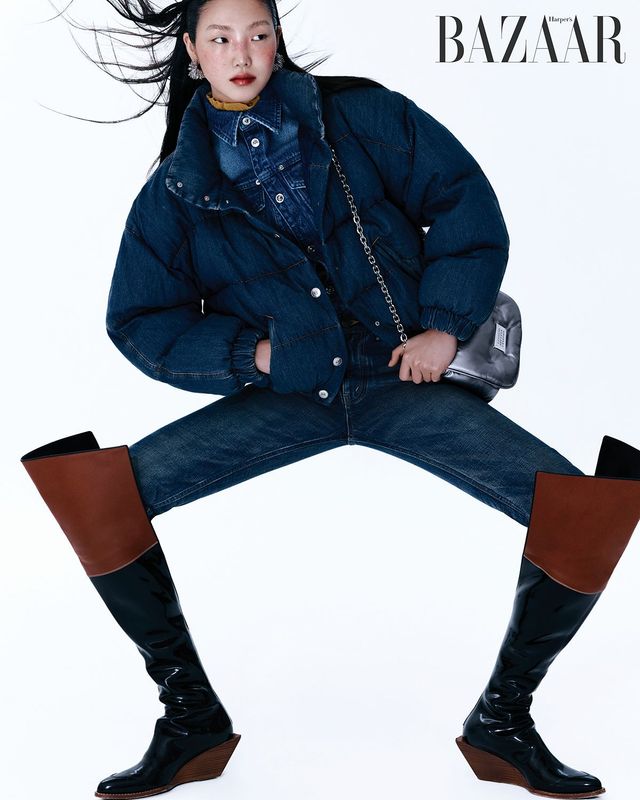 데님 소재의 푸퍼 재킷으로 즐기는 더블 데님 스타일링. 허벅지까지 감싸는 사이하이 부츠로 슬림한 실루엣을 연출할 것.