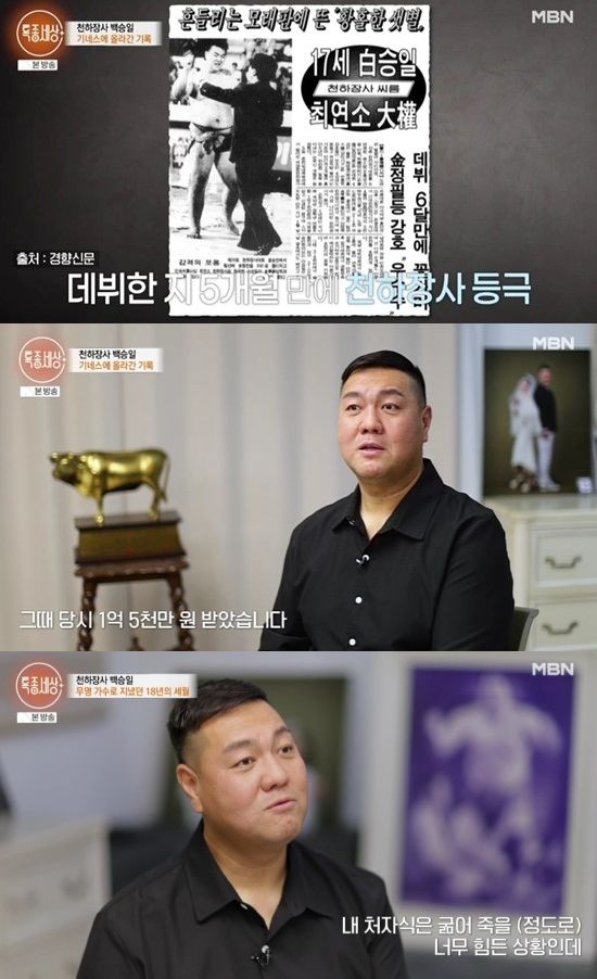 18살에 천하장사가 된 강호동보다 1년 빠른 17살에 천하장사 타이틀을 얻었던 백승일은 데뷔 5개월 만에 천하장사에 등극해 당시 1억 5천만 원이라는 거액의 계약금을 받고 프로 팀에 입단했다고 설명했다.
