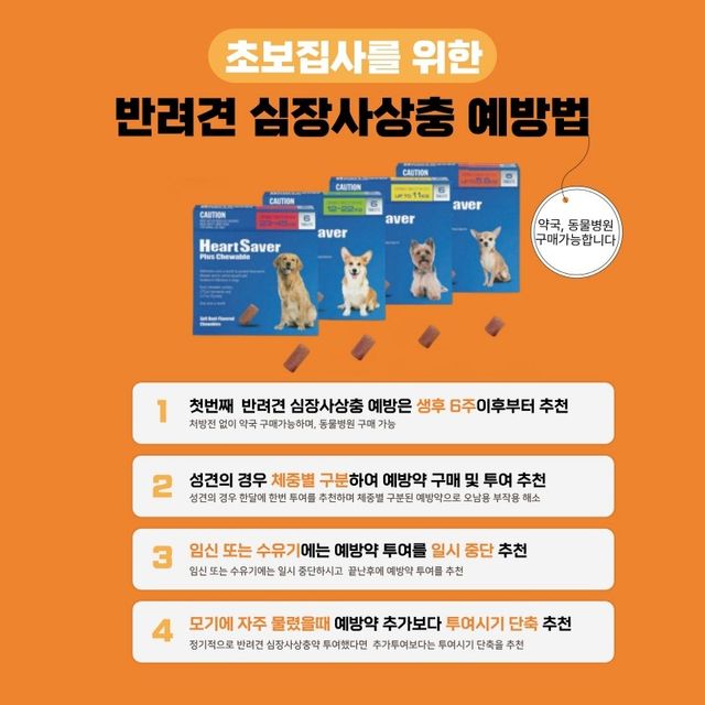 반려견을 입양하거나 새끼 강아지를 처음 키우게 되는 초보 집사의 경우 반려견 심장사상충 첫 번째 예방시기, 성견 경우 예방약의 주기와 분량, 반려견의 임신 및 수유 기간 중 예방약 투여 여부에 대한 문의가 많다.