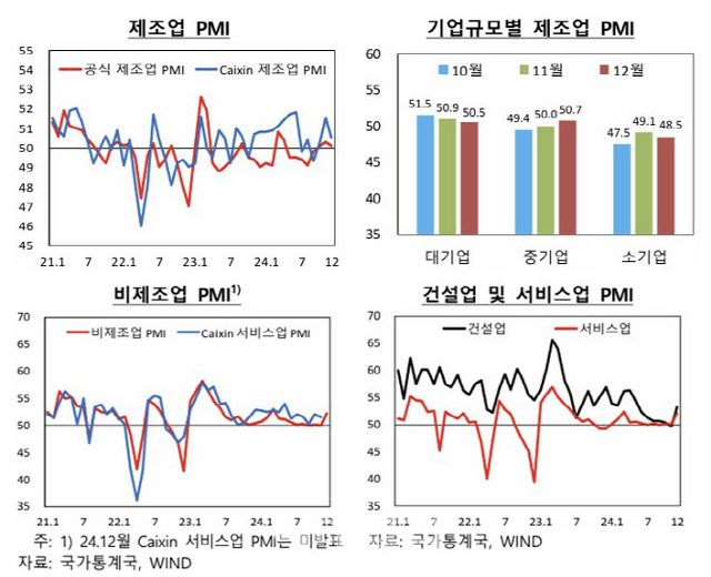 신만홍원은 “제조업 PMI가 소폭 둔화했으나, 중국의 역외 공급망 구조조정 가속화 등으로 신규수출주문이 개선되고 이구환신 정책 및 다가오는 춘절 연휴의 영향도 더해지면서 신규주문과 생산은 양호한 모습”이라고 평가했다. 은하증권은 “건설업 PMI는 중국정부의 정책 지원 등의 영향으로 반등했고, 서비스업 PMI도 정부의 내수 진작책과 신정 및 춘절 연휴에 대한 수요 개선 기대감이 높아지며 상승했다”고 했다.
