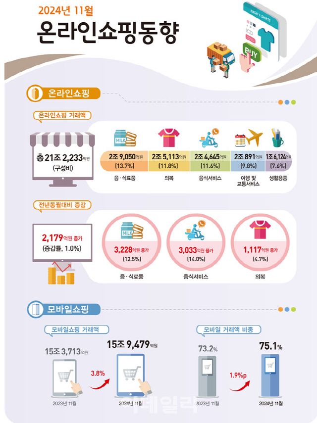 3일 통계청이 발표한 ‘2024년 11월 온라인쇼핑 동향’을 보면 이달 총거래액은 21조 2233억원으로 집계됐다. 전월보다 9347억원 껑충 늘면서 2017년 1월 관련 통계 작성 이후 최대치를 기록했다. 다만 전년동월대비로는 1.0%(2179억원) 늘은 정도다. 총 거래액 증가폭은 전년동월대비 0.7% 증가했던 전월에 이어 역대 두번째로 낮다는 게 통계청 설명이다.