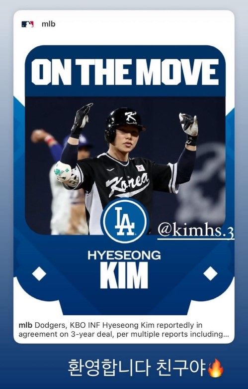 오타니는 김혜성의 계약 소식이 전해지자 자신의 소셜미디어(SNS)를 통해 김혜성의 사진과 함께 한글로 '환영합니다 친구야'라고 적었다. 오타니는 김혜성이 다저스를 선택하는 과정에서 조언해준 것으로 알려졌다.