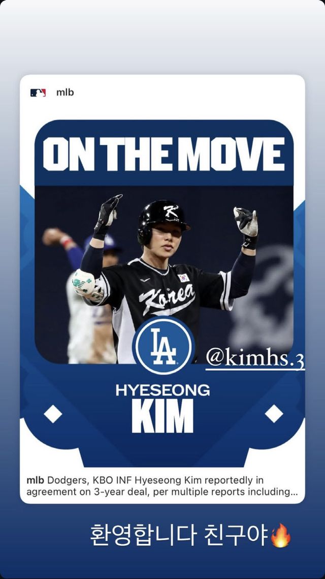 다저스 역시 SNS를 통해 김혜성 영입 소식을 전하며 한국어와 영어로 다저스에 온 걸 환영한다고 밝혔다.