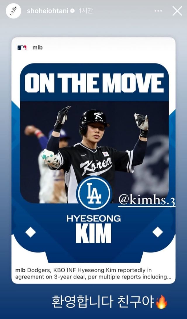 오타니 쇼헤이가 김혜성의 다저스 계약 발표 게시물을 공유하며 한국어로 "환영합니다 친구야"라는 코멘트를 남겼다. / 오타니 쇼헤이 인스타그램