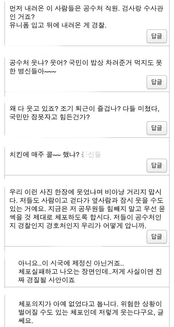 한 누리꾼은 “수사팀도 새벽부터 고생했을 텐데, 결과 없이 철수하는 상황이 어이없어서 웃었을 것”이라며 “결국 문제는 윗사람들의 지시”라고 주장했다.