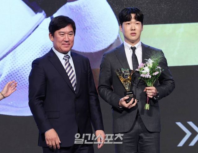 ‘2024 신한 SOL뱅크 KBO 시상식’이 11월 26일 오후 서울 롯데호텔월드에서 열렸다. 두산 조수행이 도루상을 조계현 전력강화위원장으로부터 수상하고있다. 정시종 기자 capa@edaily.co.kr