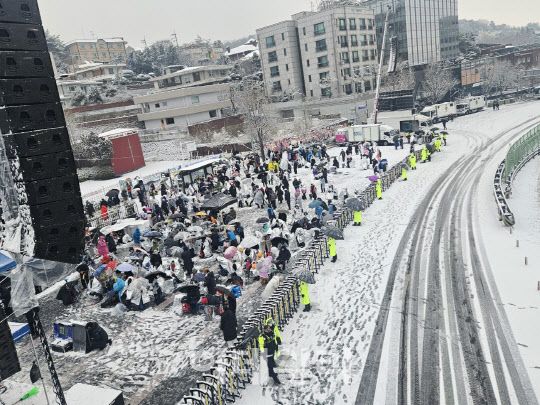 이데일리가 방문한 용산구 한남동 대통령 관저 일대에서는 집회 참가자들이 오전 사이 내린 함박눈을 치우고 있었다. 양측은 이날 오후 집회를 준비하면서도 충돌 가능성을 예의주시했다. 집회 중 마찰을 막고자 경찰이 길목마다 세운 철제 펜스와 육교 계단 앞에는 집회 참가자들이 서서 “우회하라”고 안내했다. 이 일로 일부 시민은 “눈까지 오는데 길마저 막혀서 돌아가야 한다”며 불평했고, 인근 건물의 경비원들은 “눈이 오는데 막 들어와서 있으니 바닥을 청소하는 사람들이 꽤 고생할 것이다”며 고충을 토로하기도 했다.