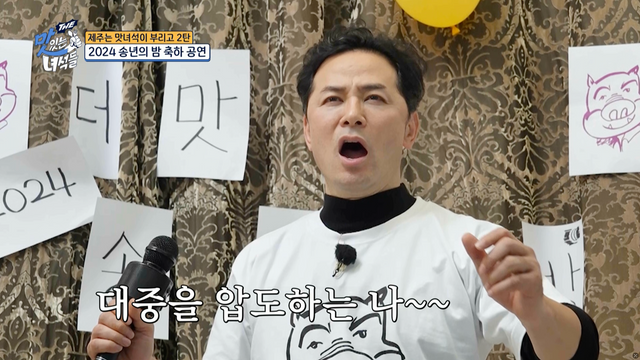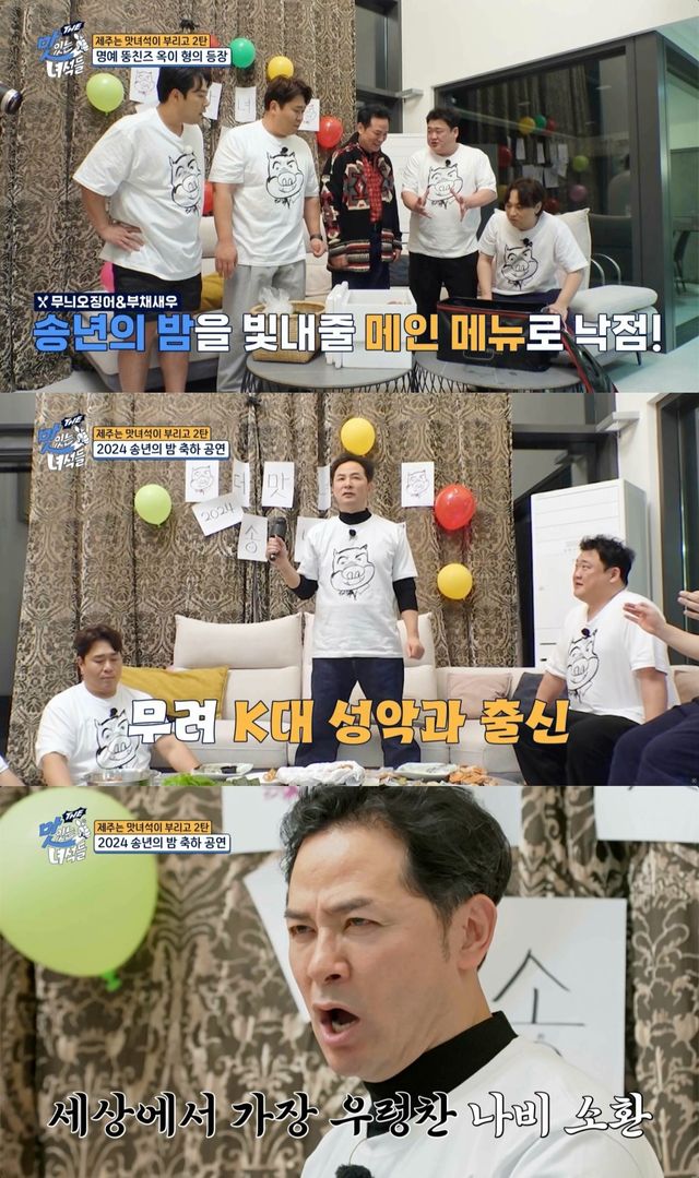 잠시 후 무늬오징어와 부채새우, 치킨, 김밥 등으로 푸짐한 한상이 차려지고 각각의 메뉴를 맛본 멤버들은 싱싱한 제주의 맛에 감탄사를 이어간다. 그러던 중 기분이 좋아진 김해준은 개사까지 하며 뮤지컬 노래를 선보이고 황제성은 “김해준은 긴장해야 한다. 김해준의 빈자리를 노리는 사람이 있다. 그분은 성악을 전공했다”라며 김창옥 교수와 김해준의 경쟁구도를 만든다.