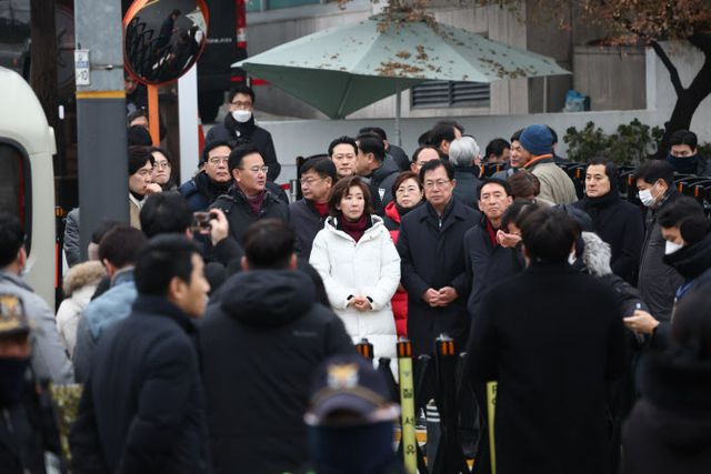 윤석열 대통령의 체포영장 유효기간 만료일인 6일 오전 서울 용산구 한남동 대통령 관저 앞에 국민의힘 나경원, 유상범, 김석기, 김기현 등 의원들이 대기하고 있다. (사진 = 연합뉴스)